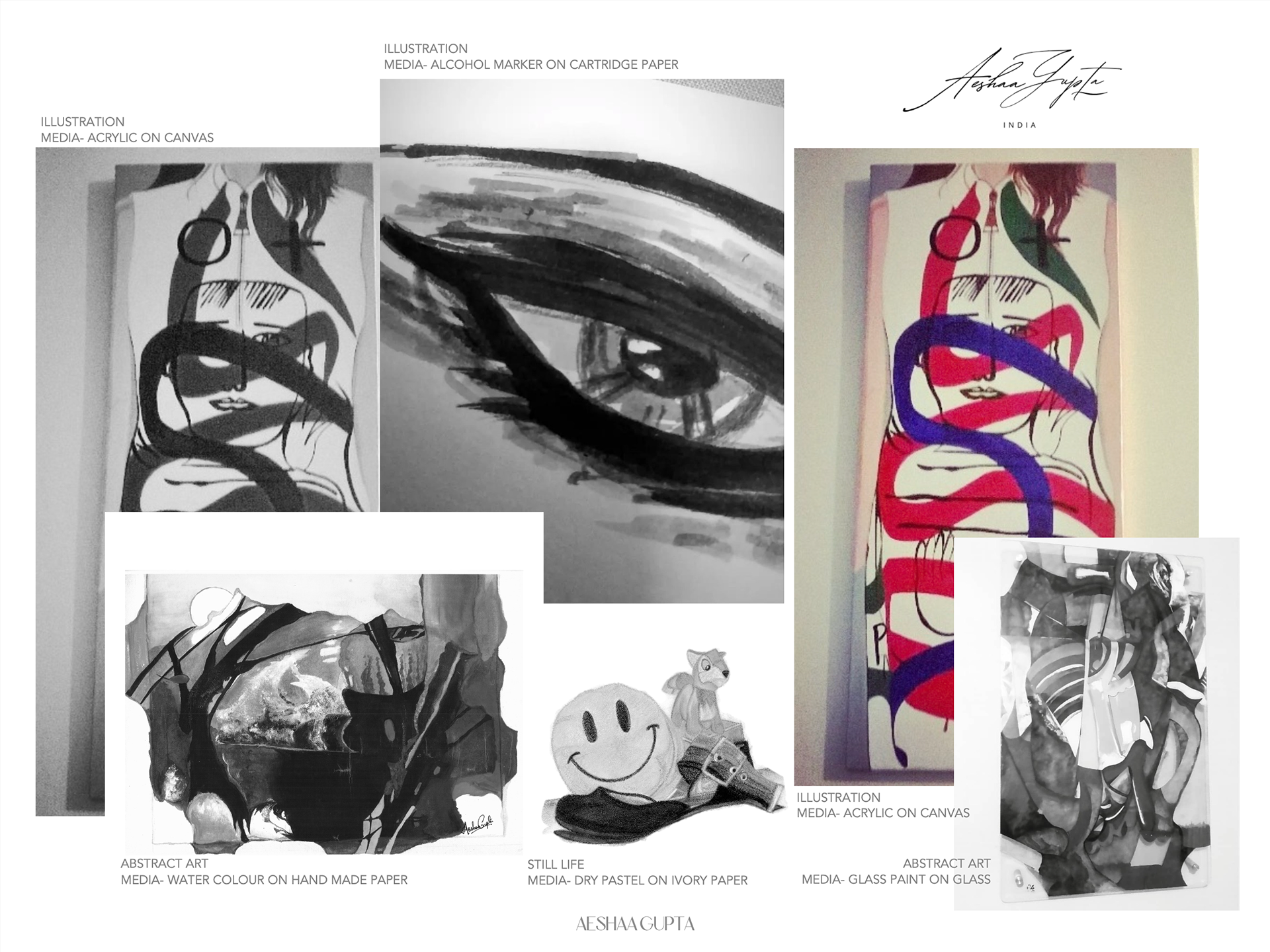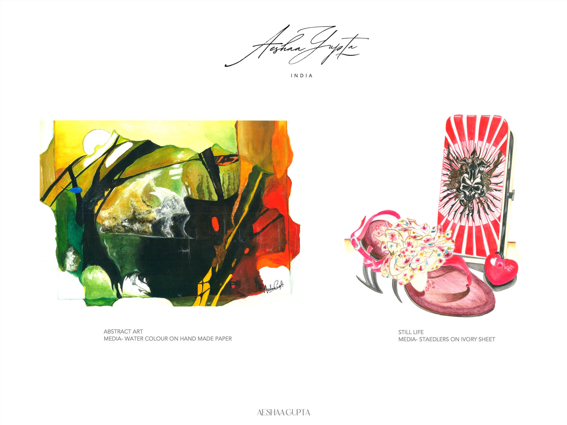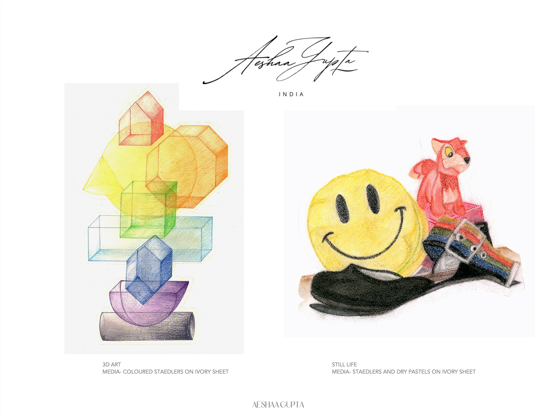 Still life rendering using charcoal, shading pencils, stealers, on cartridge, ivory, and handmade papers, including wash effects.